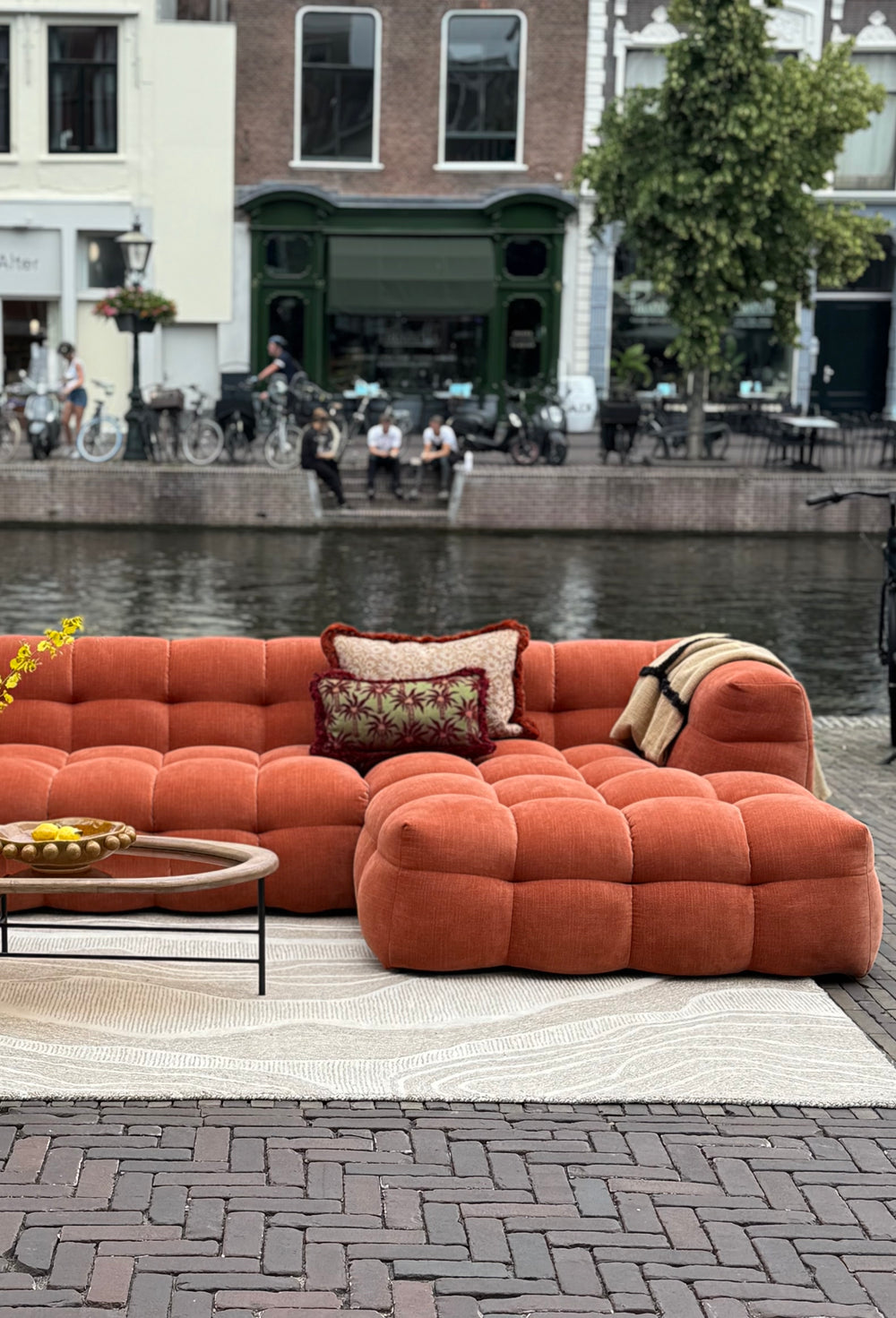 Op de foto hebben wij deze bank in een warme oranje Terranova stof. Uiteraard zijn er nog veel meer kleuren en stoffen mogelijk. Wil je andere stofmogelijkheden en opstellingen bekijken? Kom dan langs in de winkel.