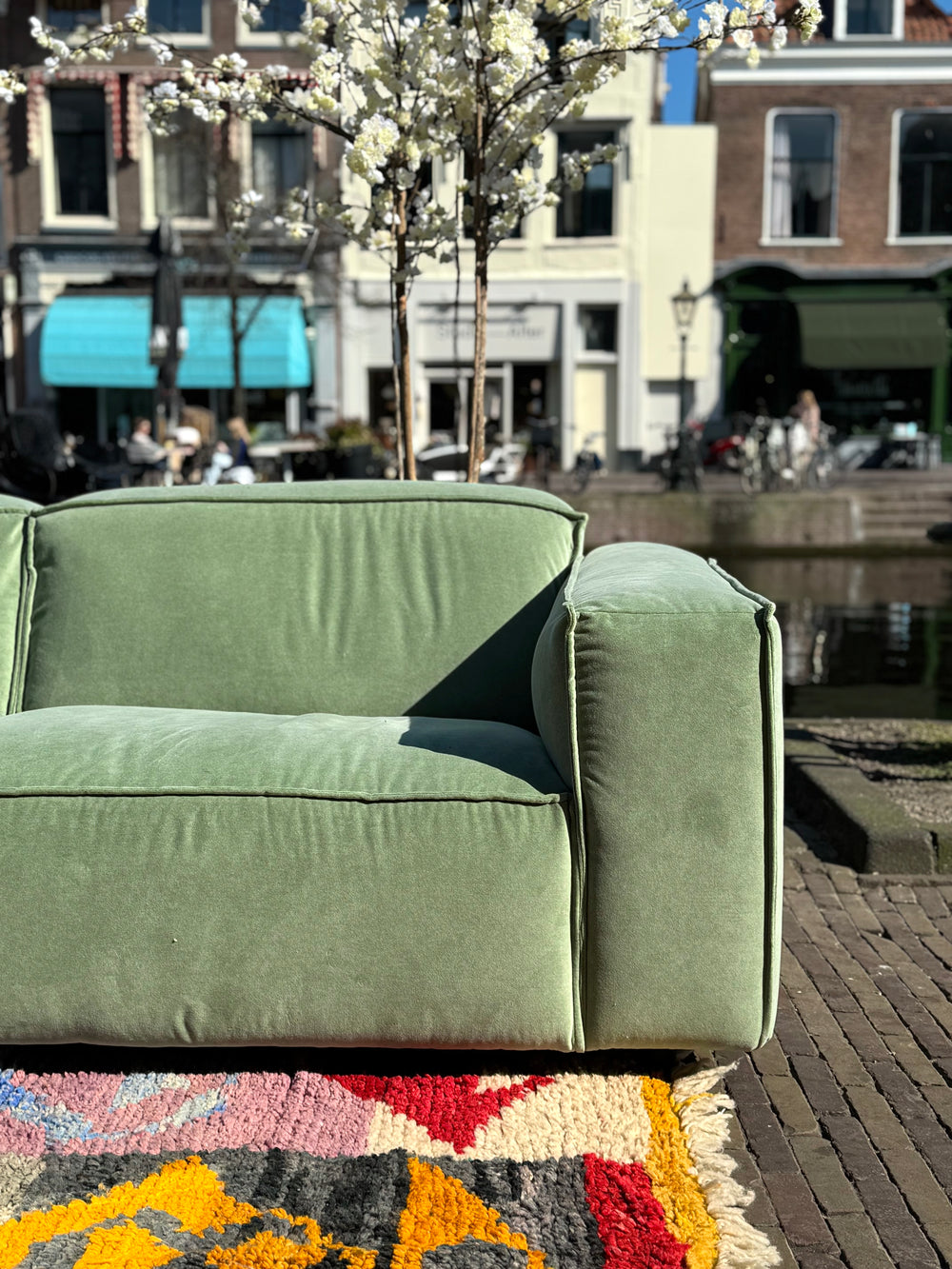 Er zit een heerlijke fijne rib stof op de bank. De bank heeft een prachtige mintgroene kleur en zachte velvet stof. Uiteraard zijn er nog veel meer kleuren en stoffen mogelijk. Wil je andere stofmogelijkheden bekijken? Kom dan langs in de winkel.