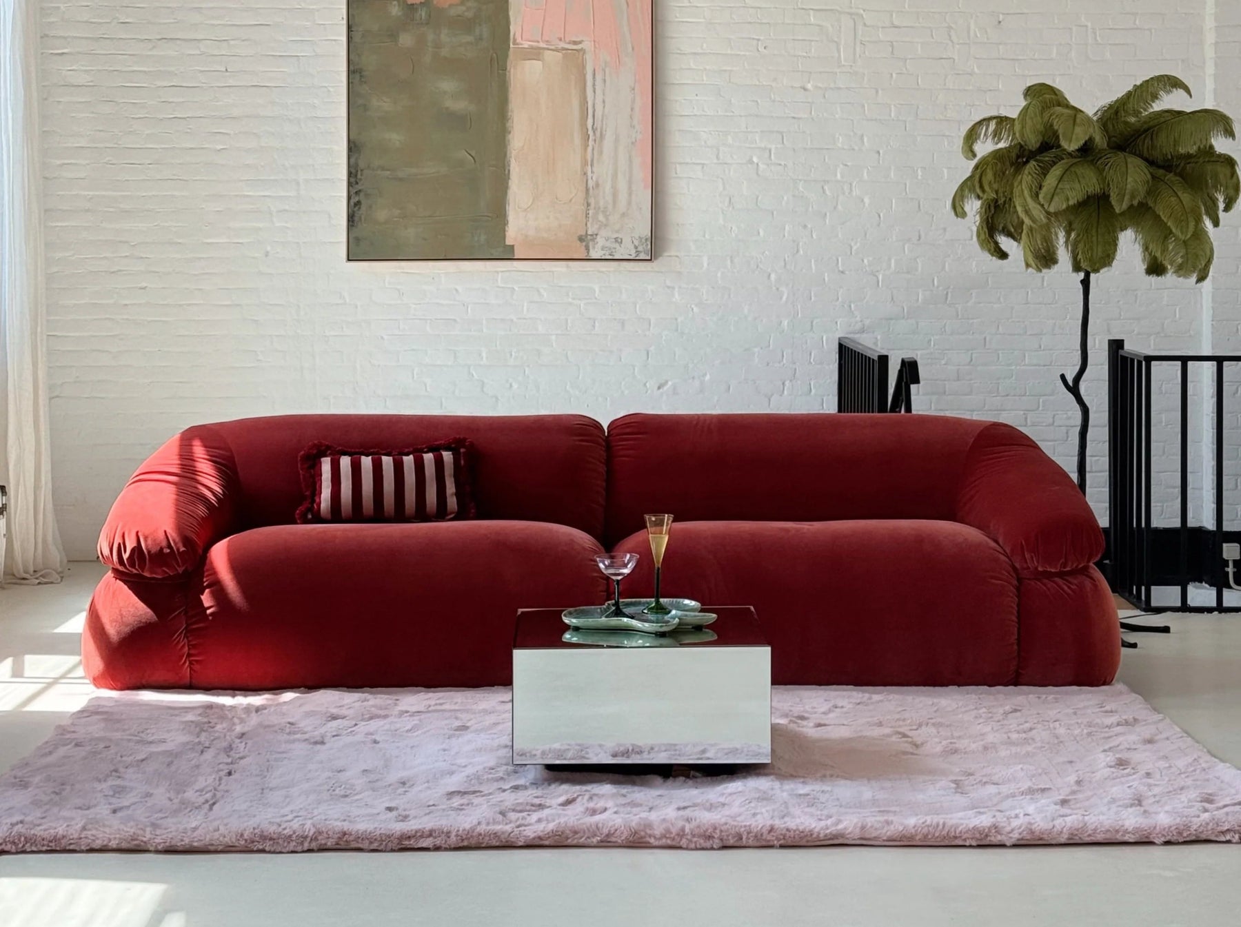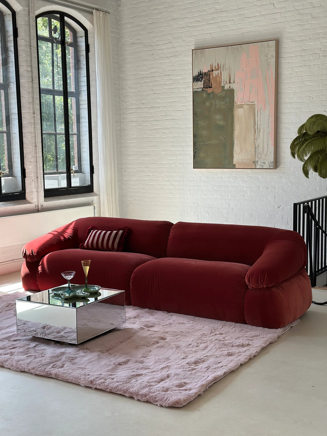 Wij verkopen deze bank in de winkel in de gehele stoffen collectie. Op de foto staat hij afgebeeld in een rijke velvet stof in Cherry kleur. Uiteraard zijn er nog veel meer kleuren en stoffen mogelijk. Wil je andere stofmogelijkheden bekijken? Kom dan langs in de winkel.