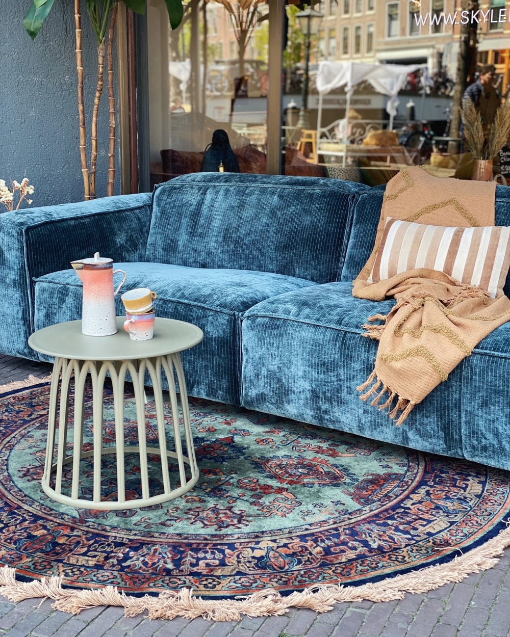 Wij verkopen deze bank in de winkel in de gehele stoffen collectie. Op de foto staat hij afgebeeld in een petrol blauwe ribstof. Dit is een zachte, luxe ribstof met mooie glans die goed past bij deze bank (let op: de stof is blauw/groen, afhankelijk van de lichtinval).