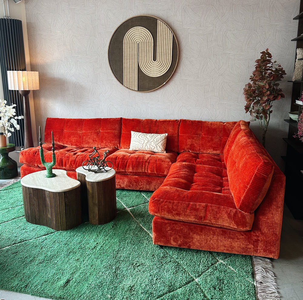 Op de foto zijn de volgende elementen te zien: een 2-zits arm L + 1-zits zonder arm + hoekelement + 2-zits arm R. Totale afmetingen zoals op de foto: 294 breed x 213 diep.