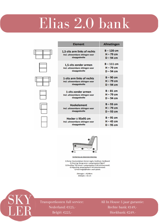 De bank is helemaal naar wens samen te stellen. We hebben meerdere elementen waar je uit kunt kiezen om zo jouw ideale bank te creëren. Op het productblad zijn de mogelijkheden te vinden.