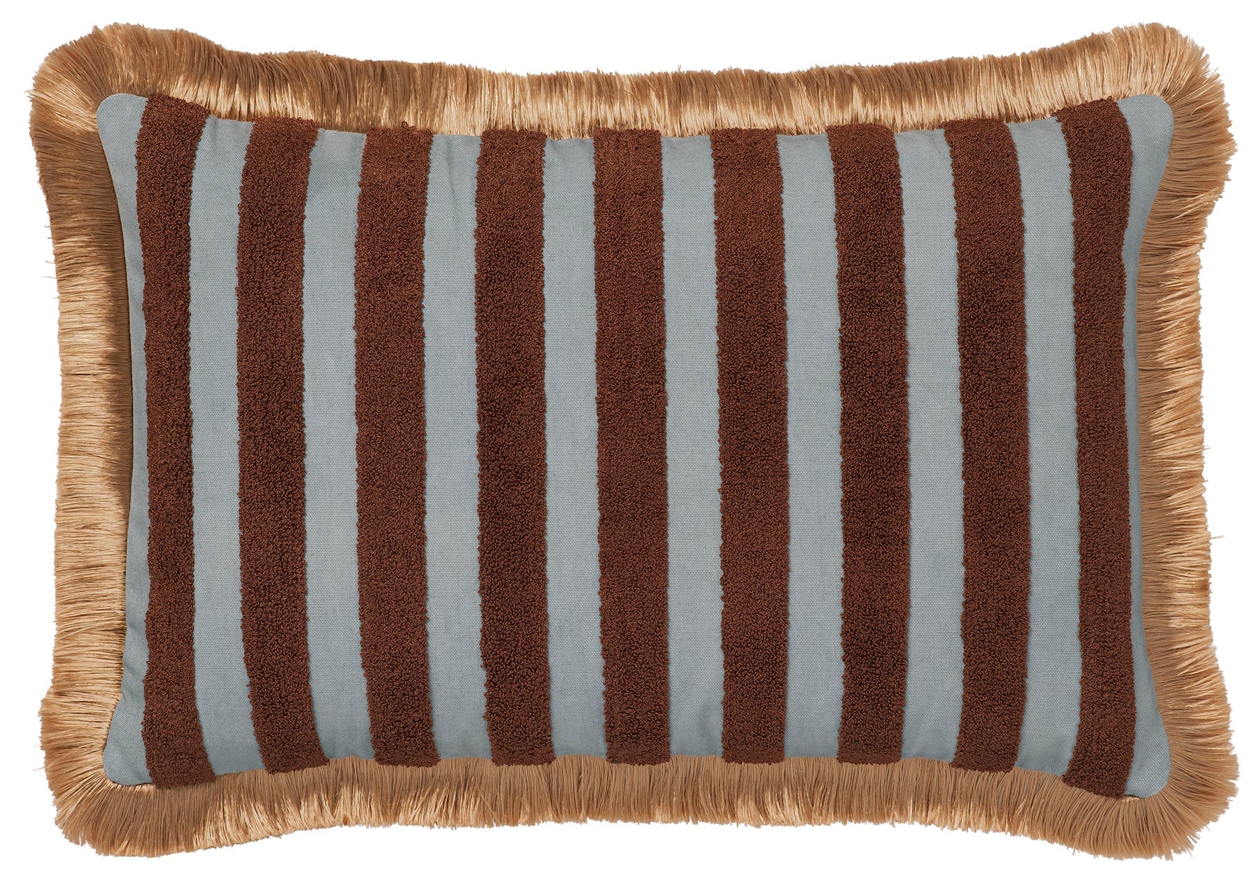 Geef je huis een vleugje verfijnde warmte met dit gestreepte kussen in rijk chocoladebruin en diep koraal. Het gedurfde contrast en de luxueuze franjes brengen elegantie en karakter, waardoor het een opvallend stuk wordt dat direct elke bank of bed verheft.