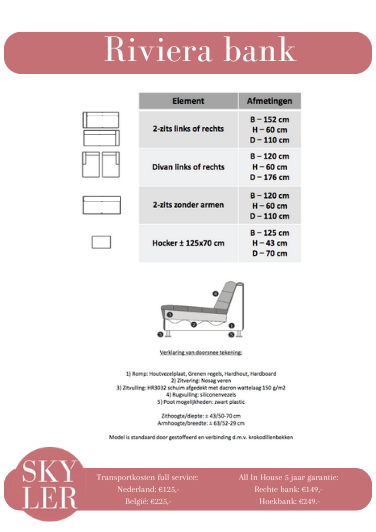 Voor aanvullende en/of speciale bezorg wensen; Verhuislift of montage, kan je mailen naar info@skylerstore.nl Deze bezorg voorwaarden gelden voor bestellingen die via de webwinkel worden geplaatst en zijn expliciet voor leveringen binnen Nederland met uitzondering van de Waddeneilanden. Ook leveringen van banken en andere meubelen naar België, Luxemburg, Duitsland, Frankrijk, Italië en Spanje zijn mogelijk tegen een meerprijs.