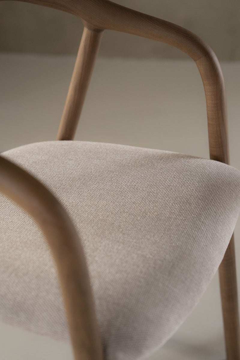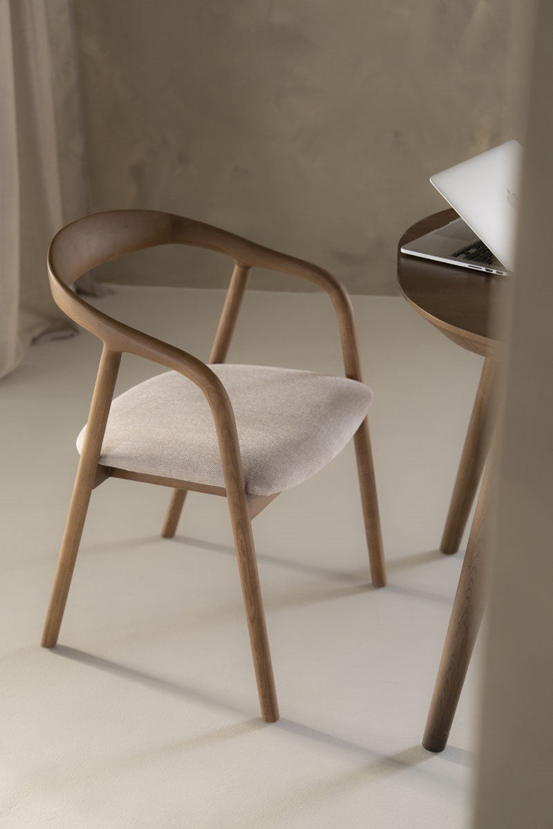 Eetkamerstoel Ray is een elegante stoel met een gestoffeerd zitkussen. Door het subtiele houtwerk heeft het een open uitstraling in de ruimte. Verkrijgbaar in de kleur naturel en bruin.